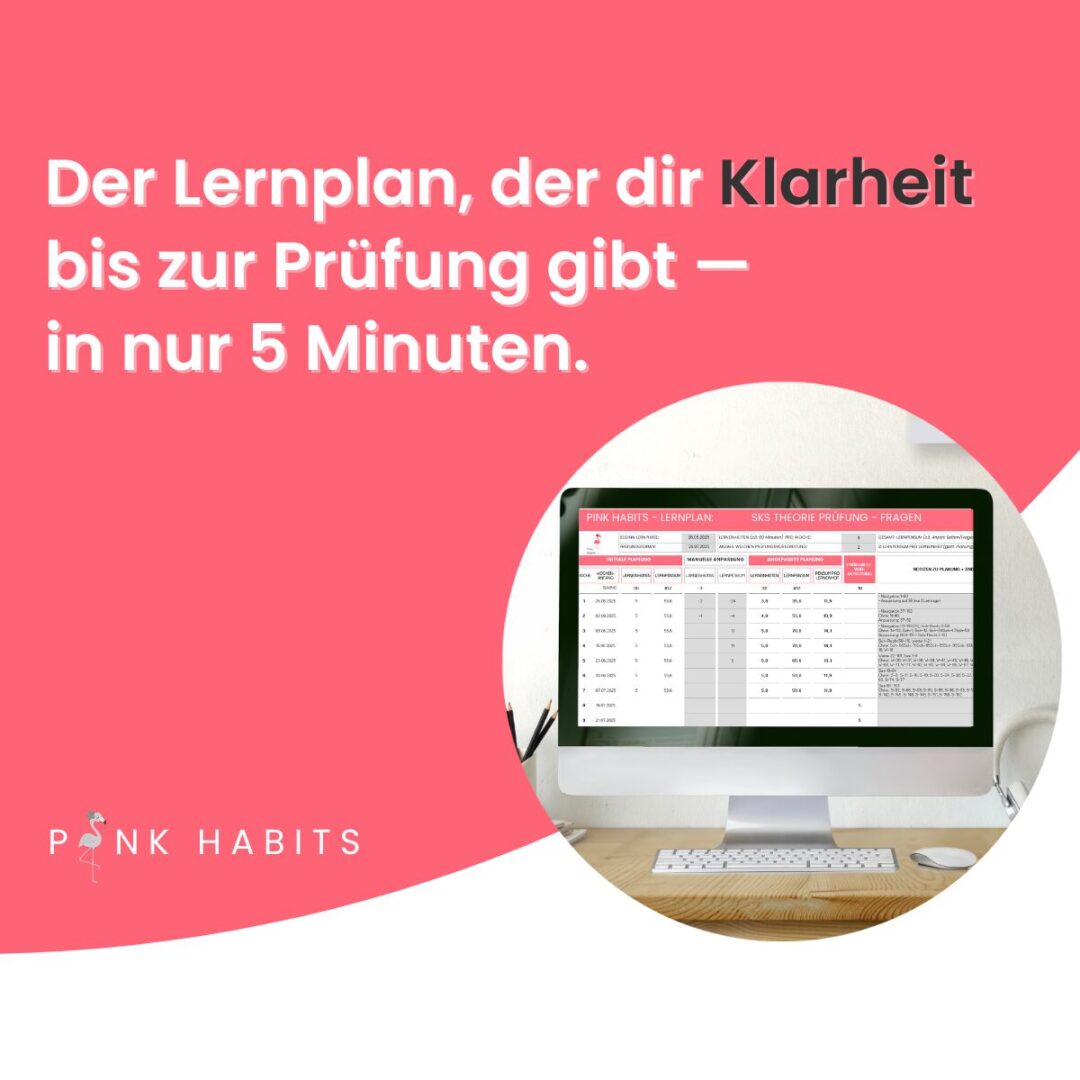 Ohne Übersicht wirkt alles schnell zu viel – besonders im vollen Alltag. Mit der richtigen Struktur wird Lernen kalkulierbar, machbar und viel weniger belastend – selbst wenn du wenig Zeit hast. Mit dem 👉 Pink Habits Lernplaner behältst du den Überblick.